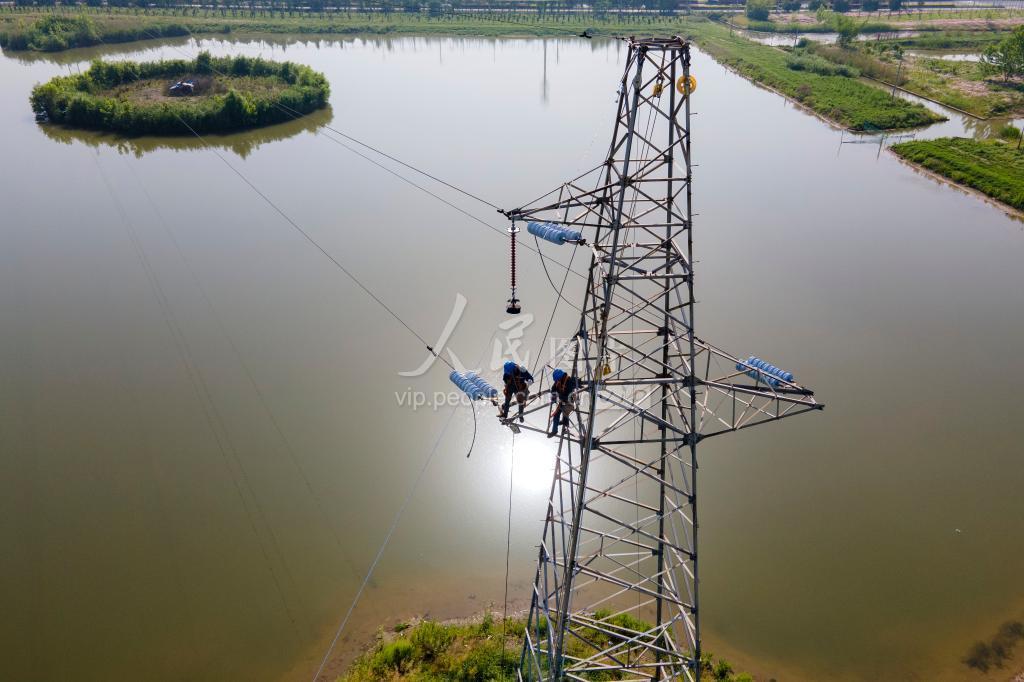 2021年5月5日,在江苏泰州高港区引江河船闸附近,抢修人员对用户受损电力线路110千伏滨海线进行抢修。