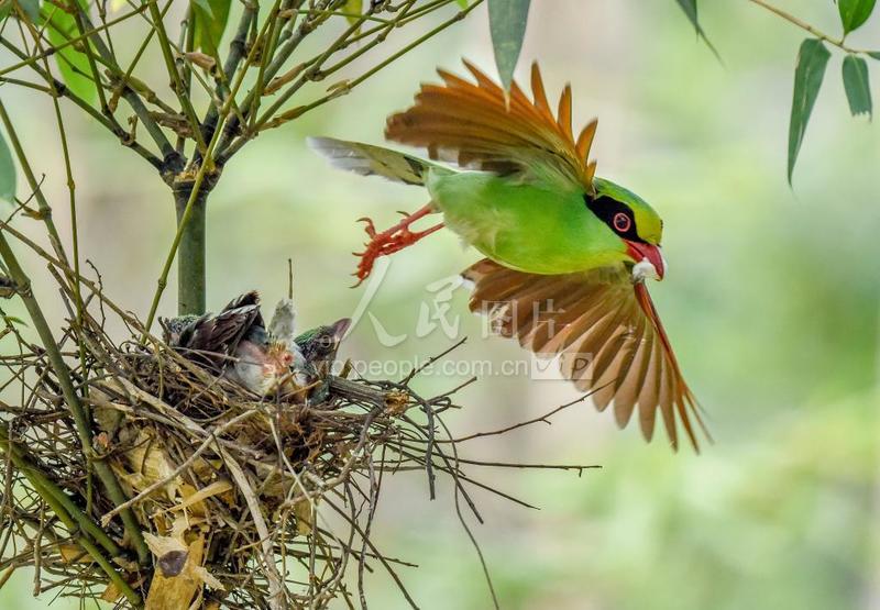 2021年5月3日,蓝绿鹊归巢喂食幼鸟。