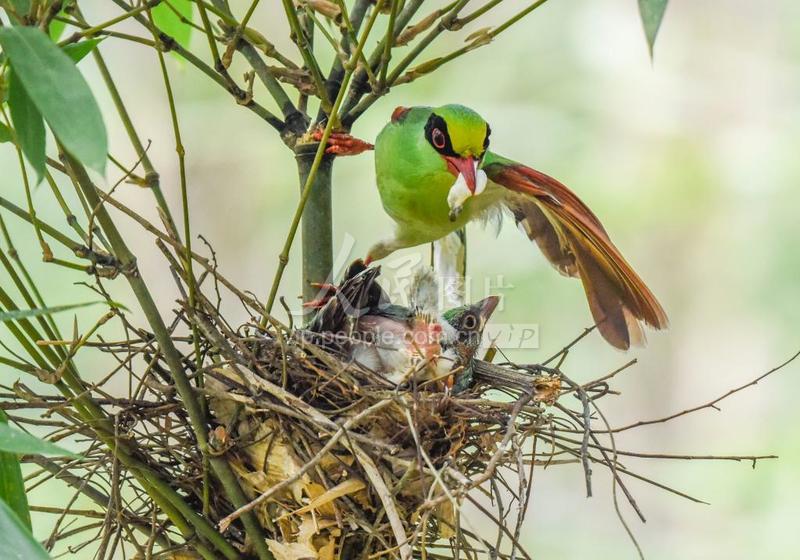 2021年5月3日,蓝绿鹊归巢喂食幼鸟。