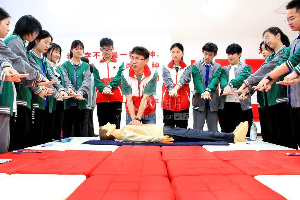 2021年5月7日,安徽省淮北市红十字安全体验馆里,红十字小志愿者服务队成员指导实验高级中学学生如何正确掌握心肺复苏等应急救护操作要领。