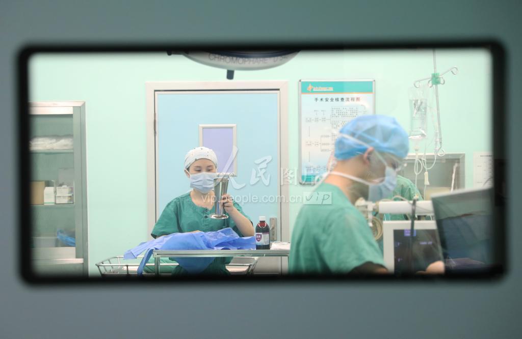 2021年5月11日,湖南省衡阳市南华大学附二医院手术室,陈雪池(左一)在工作中。