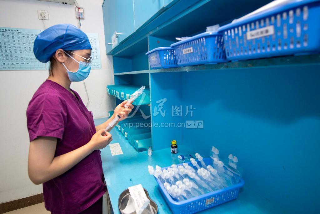 2021年5月12日,在江苏省泰州市人民医院新生儿重症监护室(NICU),护士赵爱凤在配置药液。