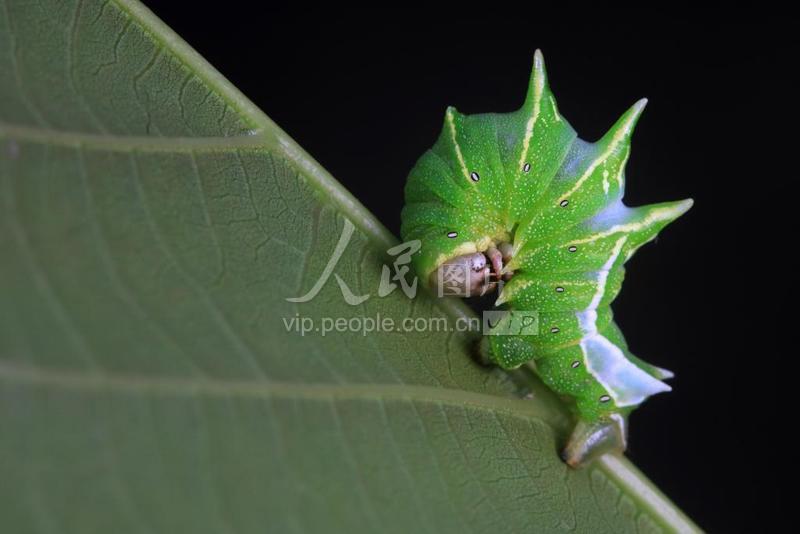 2021年5月15日,河北省唐山市滦南县罗城公园里,一只桑褶翅尺蛾幼虫在植物上爬行。