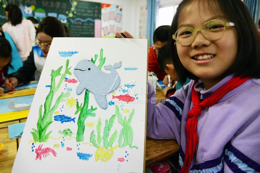 2021年5月20日,在江苏省镇江市李家大山小学,一名小学生在展示江苏科技大学志愿者指导她绘制的“保护江豚”纸浆画。