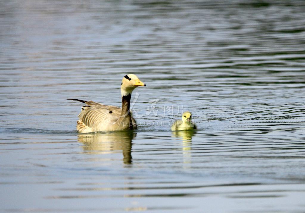 2021年6月11日,一只斑头雁带着一只斑头雁小宝宝在甘肃省张掖国家湿地公园湖中游玩。