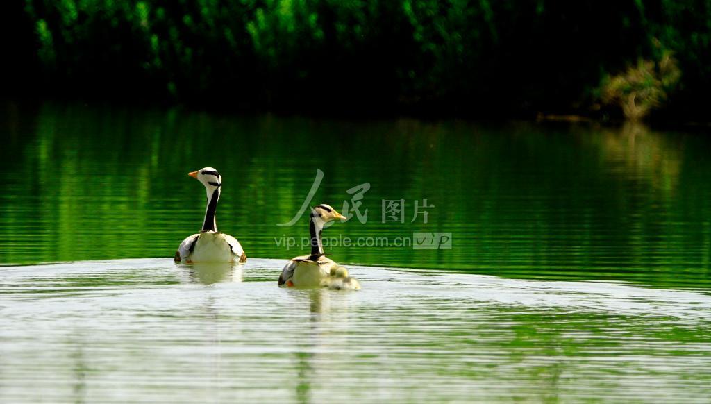 2021年6月11日,两只斑头雁小宝宝随妈妈在甘肃省张掖国家湿地公园湖中游玩。