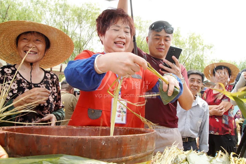 2021年6月11日,在浙江省湖州市南浔区和孚镇举行的第五届江南·民当端午民俗文化旅游节上,村民正参加包粽子比赛。