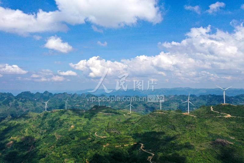 2021年6月16日,贵州省黔西南布依族苗族自治州册亨县冗渡镇和坡妹镇交界的大顶柱,风力发电机正迎风发电。 贵州省黔西南布依族苗族自治州册亨县地处云贵高原向广西低山丘陵的过渡地带,有丰富的风力资源。该县引进企业在县境内建设安装18台2.2兆瓦风机的风电场,每年可为电网提供清洁电能7777.8万度电,为国家西电东送工程贡献力量的同时,也有力地助推地方经济社会发展。