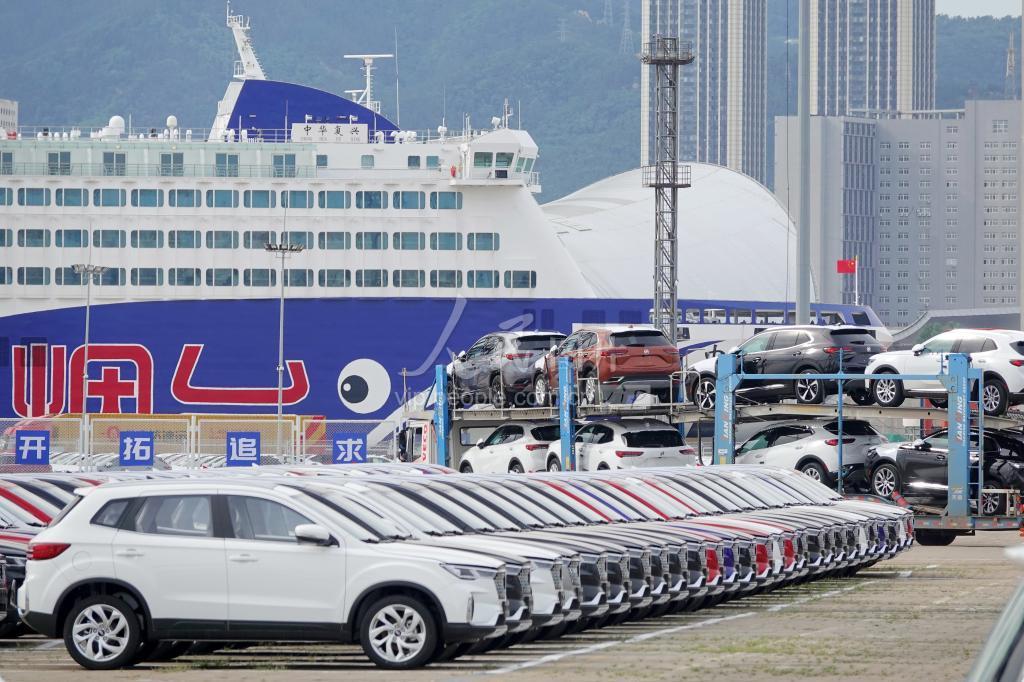 2021年7月15日, 大批商品车在山东港口烟台港准备装船发运。