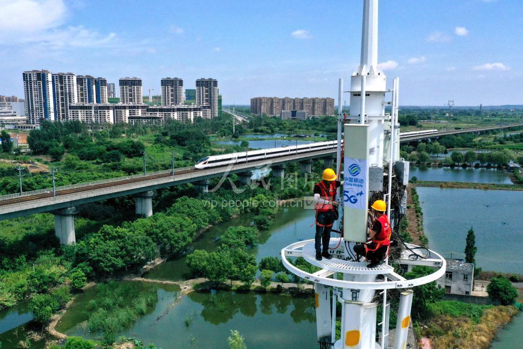 2021年7月21日,宁安高铁安徽省铜陵市铜官区西湖镇境内20号通信基站塔上,安徽移动通信铜陵分公司施工人员在进行天线设备调整优化。