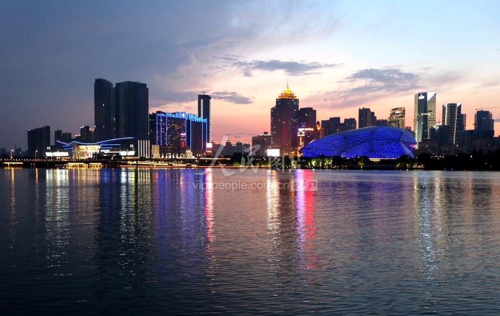 2021年7月21日晚,辽宁省沈阳市,盛京大剧院、青年大街高楼等,灯火辉煌,在浑河的映照下,天水合一,景色迷人。