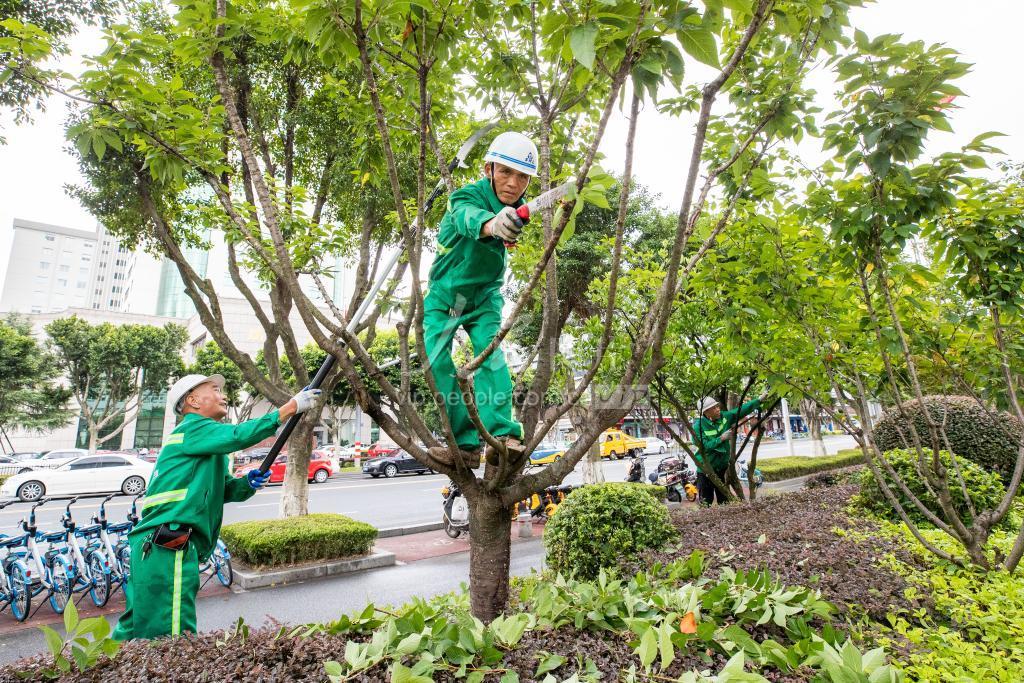 7月22日,在浙江省瑞安市万松东路,园林工人正在用钢管对处在风口的树木进行支撑加固,叶繁的树木梳枝修剪。