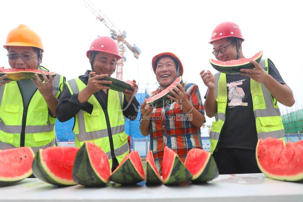 2021年7月22日,在河北省唐山市丰润区一处工地,建筑工人在吃西瓜消暑。