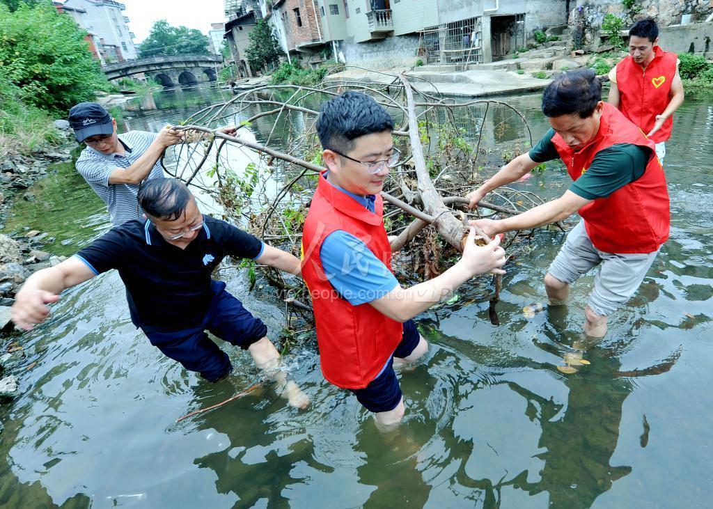7月18日,江西省上饶市信访局党员干部在该市广丰区大南镇大南村(居),和当地党员干部一起清理前阵子因洪水冲下来的河道树枝。