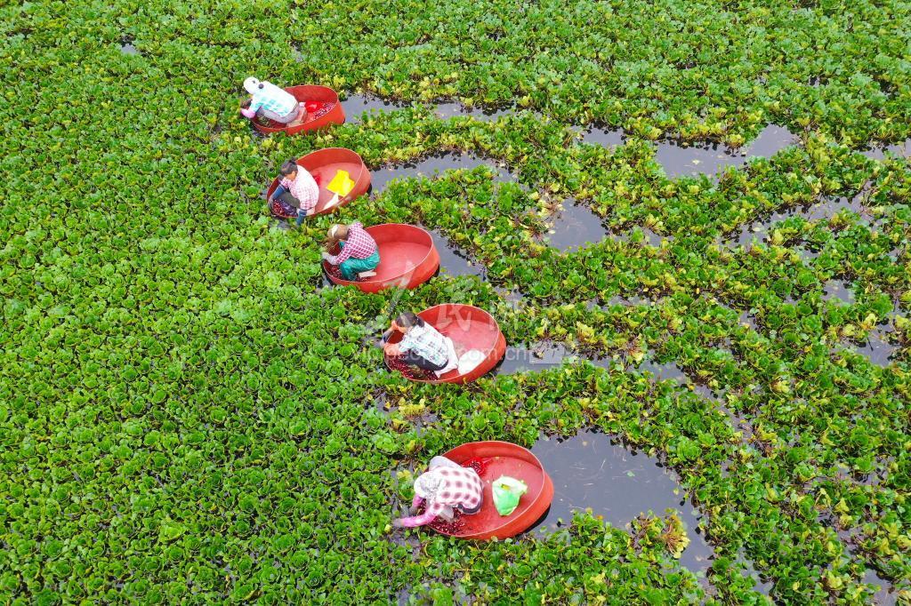 2021年7月22日,在江苏省淮安市洪泽区岔河镇,农民划着菱桶在一处水面上采摘菱角。