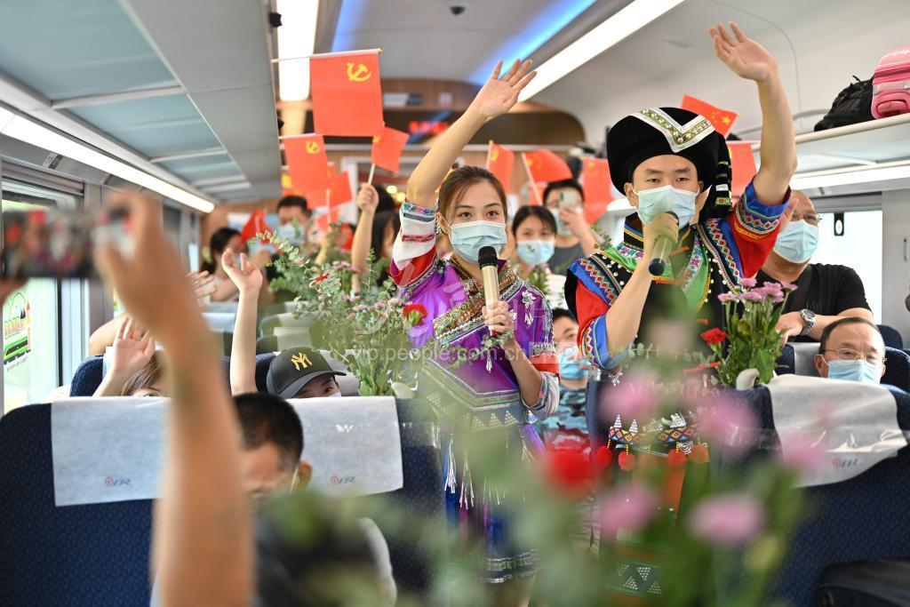 7月25日,在重庆北开往张家界西的D811次复兴号动车组列车上,身着民族服饰的列车工作人员在车厢内表演。