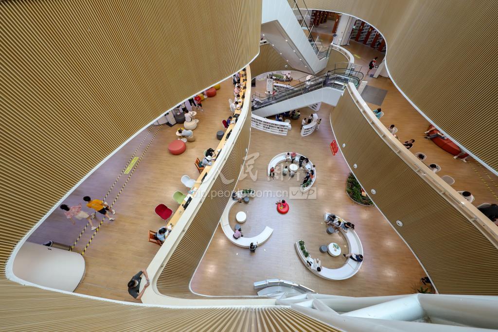 2021年7月25日,湖北省襄阳市,读者在襄阳市图书馆里阅读。 进入暑期以来,湖北省襄阳市图书馆入馆人数持续上升,周末两天进馆人数超过7000人次,不少市民来此阅读学习,消暑度夏。 襄阳市图书馆位于东津新区,建筑主体以智慧树为设计灵感,体现北宋著名书画名家米芾“城市山林”的思想,目前藏书210多万册。