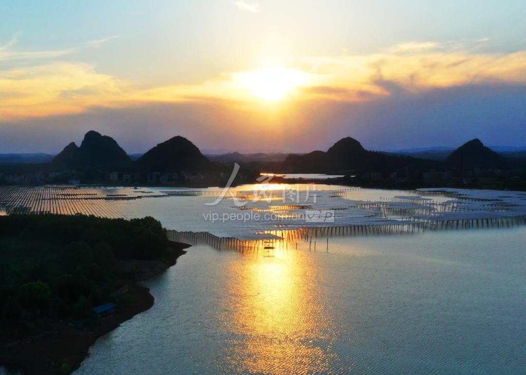 2021年8月1日,湖南省郴州市嘉禾县千家洞水库“渔光互补”光伏发电场,整齐光伏电板和洁净水面在晚霞映照下交相辉映,犹如一首首美丽和谐的“渔光曲”。 湖南省郴州市嘉禾县千家洞水库80MWp“渔光互补”光伏发电项目,总投资3.35亿元,光伏区总面积2200多亩,于近期完成施工并网发电。项目建成后,构建了水面发电,水下养殖鱼虾的绿色经济发展模式,有效推进了当地乡村振兴。