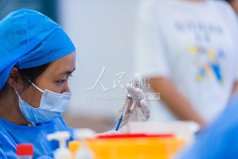 2021年8月1日,河北省邢台市柏乡县12—14周岁在校生疫苗接种工作在柏乡中学启动。一名护士在用注射器吸入疫苗药液。