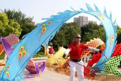 2021年8月8日,在山东省枣庄市市中区西沙河公园,爱好舞“彩带龙”的市民在进行舞龙健身。