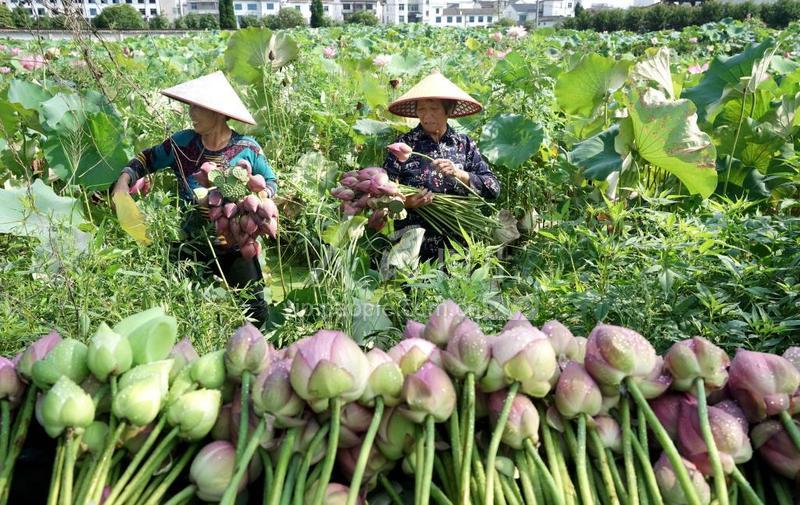 2021年8月8日,浙江省金华市武义县柳城畬族镇莲子种植户忙着采摘鲜艳的各色荷花苞和莲蓬,准备销往全国各地。 浙江省金华市武义县柳城畬族镇种植宣莲有1300多年历史,目前已形成了以十里荷花物种园为龙头的万亩宣莲产业,并通过电商平台,把荷花苞、莲蓬销往全国各地。