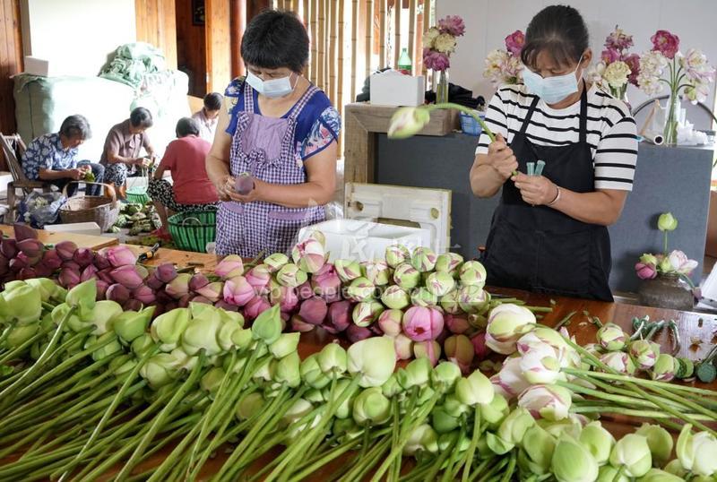 2021年8月8日,武义县宣莲种植户忙着给刚采的荷花苞修剪、加注保鲜剂、套袋、包装,发往全国各地。
