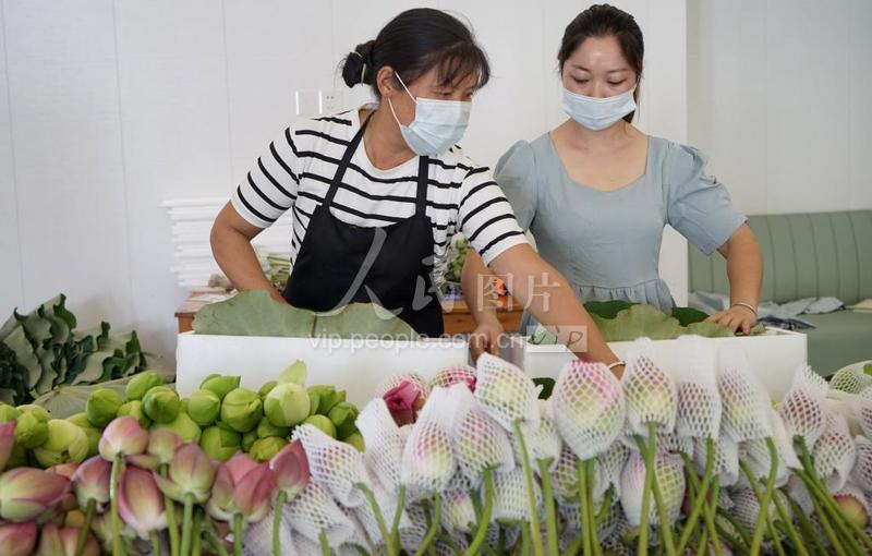 2021年8月8日,武义县宣莲种植户忙着给刚采的荷花苞修剪、加注保鲜剂、套袋、包装,发往全国各地。