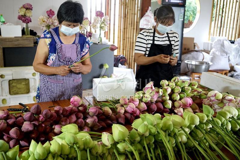 2021年8月8日,武义县宣莲种植户忙着给刚采的荷花苞修剪、加注保鲜剂、套袋、包装,发往全国各地。