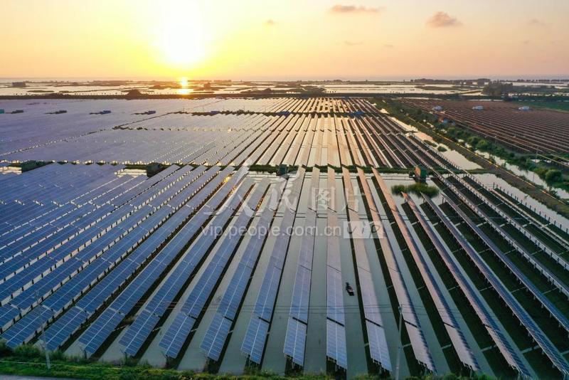 8月8日,江苏淮安金湖县塔集镇陈家圩15万千瓦装机容量的渔光互补光伏电站日出情景。