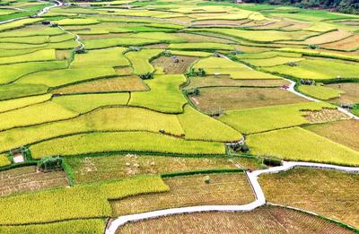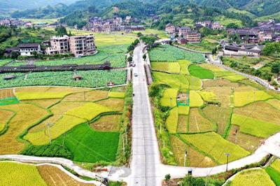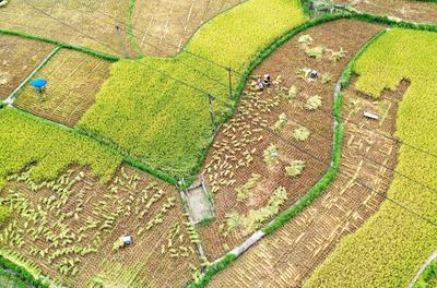 近日,广西三江侗族自治县良口乡南寨村、和里村,金黄的稻谷与特色侗寨交相辉映,田间村民正抢抓晴好天气收割稻谷,构成一幅美丽乡村的丰收画卷。