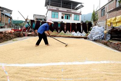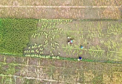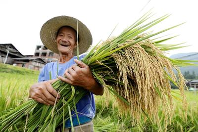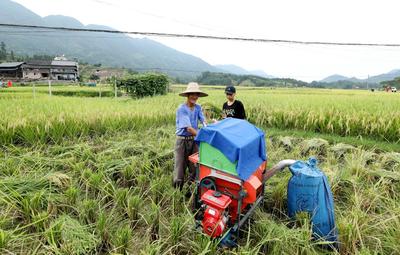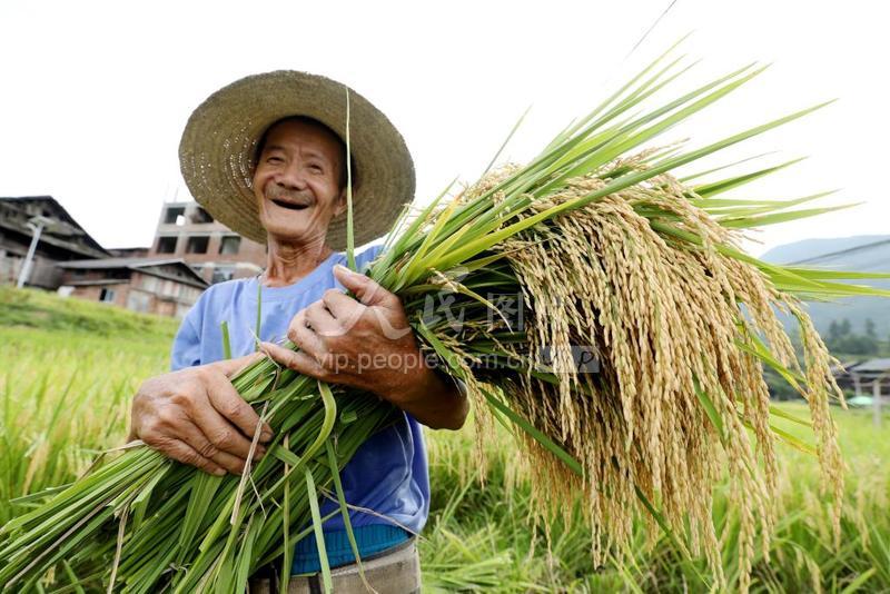 2021年8月11日,在广西三江侗族自治县良口乡南寨村,村民在田间收割稻谷。