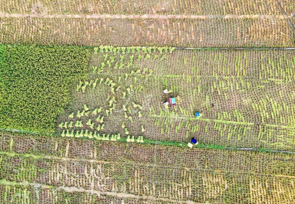 2021年8月11日,在广西三江侗族自治县良口乡南寨村,村民在田间收割稻谷(无人机拍摄)。