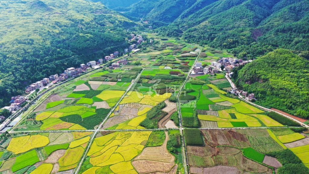 2021年8月11日,航拍湖南省永州市新田县骥村镇杨家村,金黄的中稻、绿油油的晚稻和翻耕后的菜地构成了一幅色彩斑斓的田园画卷。 近年来,湖南省新田县利用土地富硒资源优势,大力发展水稻、蔬菜种植,构建现代农业产业体系,形成了生态美、产业优的大好局面,助推乡村振兴。