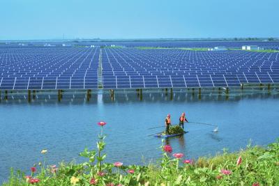 2021年8月21日下午,工作人员在当涂县大陇镇双潭湖光伏发电场清理水草,改善水域生态环境。