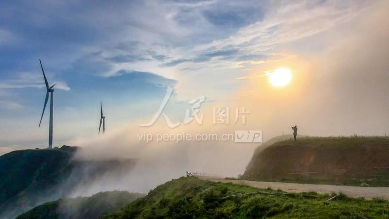 2021年8月27日,湖南省常宁市天堂山国家森林公园天堂山上,青山叠翠,云瀑奔涌,擎天矗立的风力发电机与艳阳、蓝天、云海相互映衬,壮美如画,风光无限。