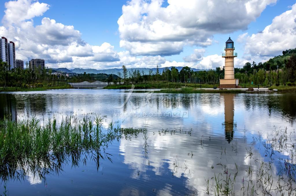2021年8月27日,四川省巴中市通江县高明湖湿地公园,碧海蓝天,白云朵朵,景美如画。