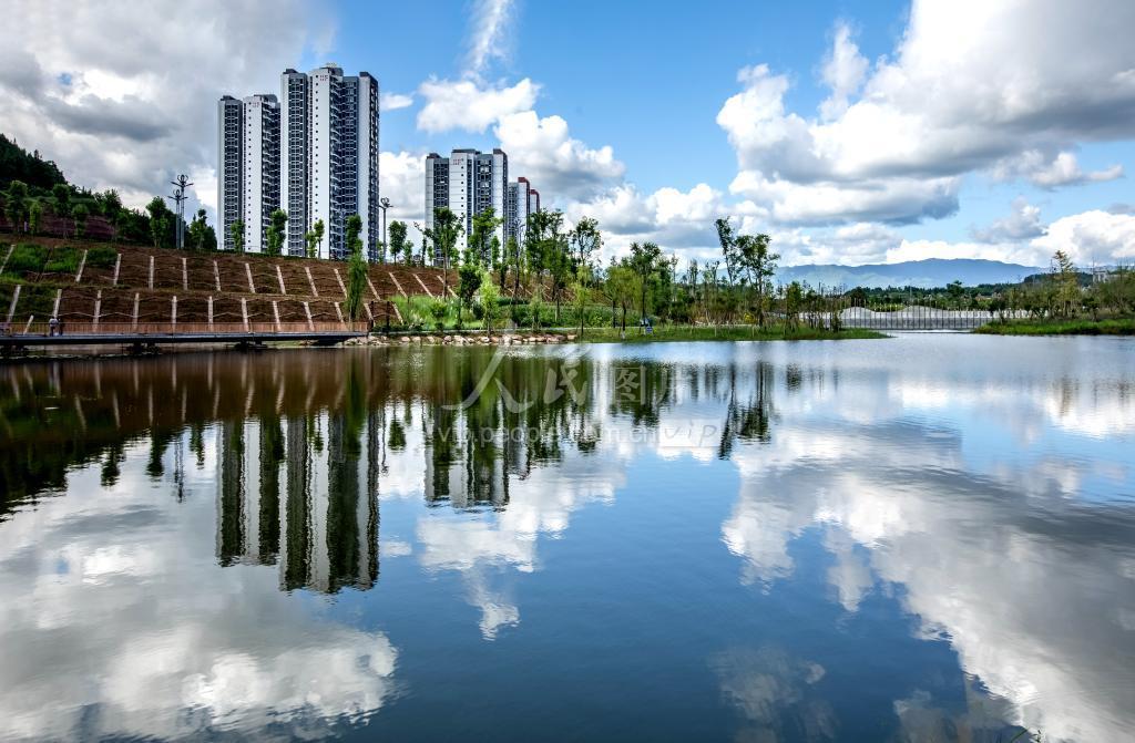 2021年8月27日,四川省巴中市通江县高明湖湿地公园,碧海蓝天,白云朵朵,景美如画。