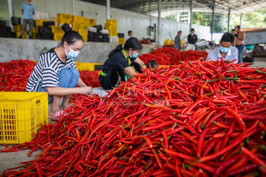 9月11日,村民在贵州省毕节市纳雍县寨乐镇革新社区分拣分装辣椒。