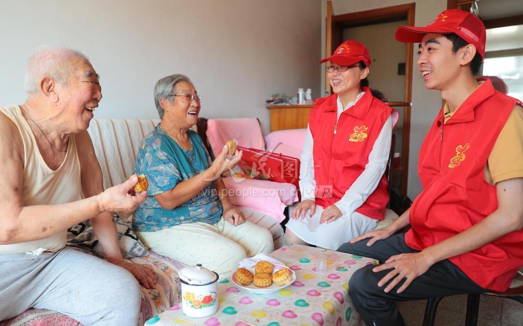 2021年9月15日,秦皇岛市海港区耀华社区工作人员陪伴特扶老人吃月饼、话家常。