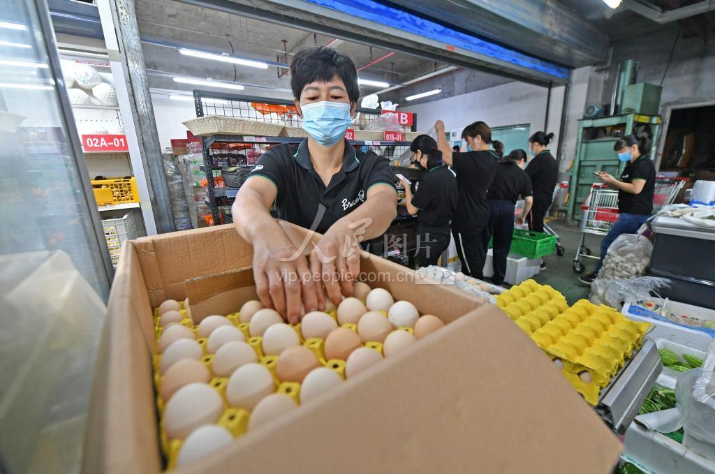 9月14日,在福建省泉州市泉港区一家超市,超市员工正在打包准备给界山镇等大前村村民配送生活物资。