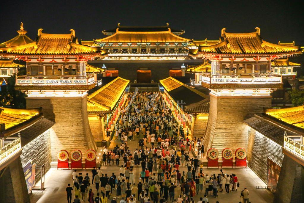 2021年9月15日,湖北襄阳唐城景区灯光璀璨,游人如织。