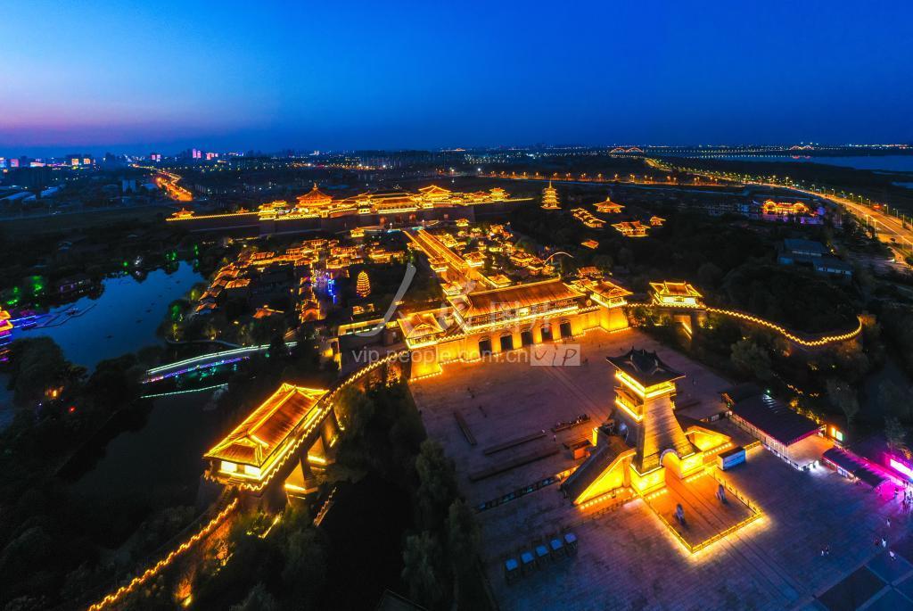 2021年9月15日,湖北襄阳唐城景区灯光璀璨,游人如织。