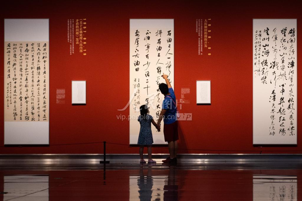 2021年10月4日,家长带着孩子在位于南京的江苏省美术馆欣赏展出的书法作品。