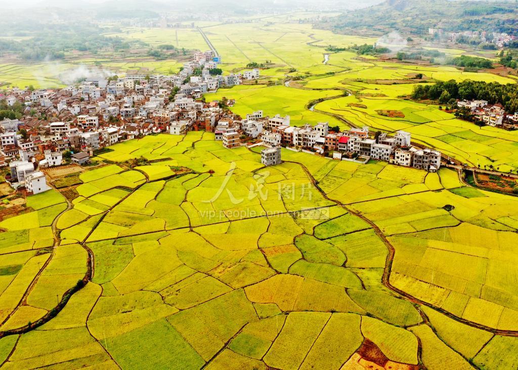 2021年10月5日,湖南省郴州市嘉禾县普满乡板贝村一带,金色稻田,美丽如画。金秋时节,嘉禾县普满乡的1.3万多亩优质水稻陆续成熟,与公路、田埂、村庄相互辉映,构成一幅乡村画卷。