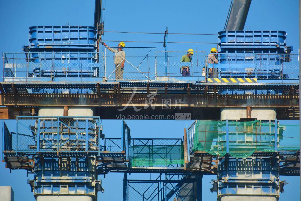 2021年10月6日,在G42S上海至武汉高速公路无为至岳西段,工人们正在建设安徽省安庆市岳西县境内的衙前河大桥。国庆假期,建设者坚守工作岗位,保证项目如期推进。