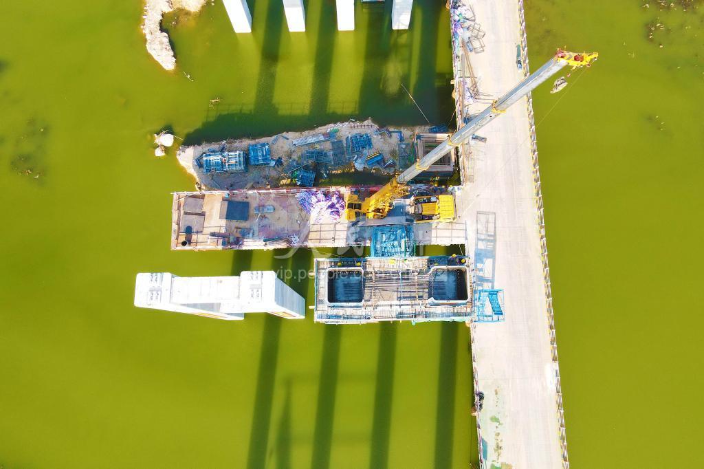 2021年10月6日,在G42S上海至武汉高速公路无为至岳西段,工人们正在建设安徽省安庆市岳西县境内的衙前河大桥。