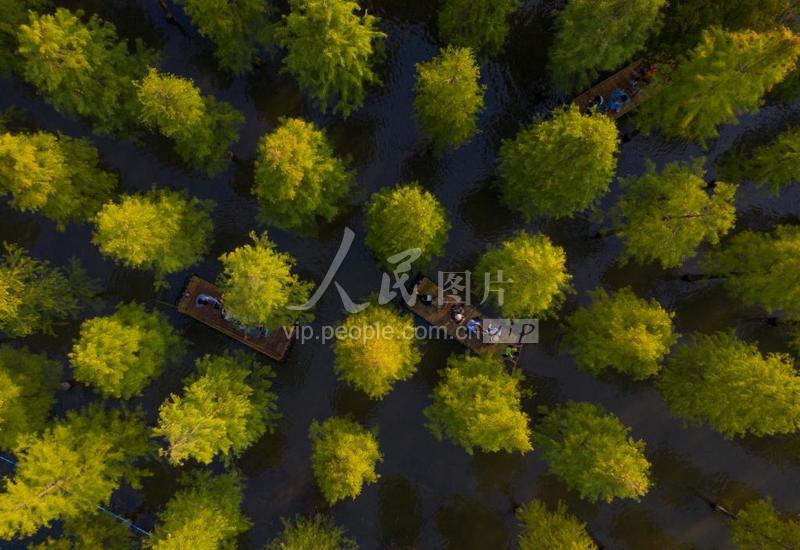 国庆假期,江苏省宿迁市泗洪县洪泽湖湿地景区水杉林,游客撑着竹筏在水杉林中穿梭游览,亲近自然美景,乐享假期生活。 泗洪洪泽湖湿地景区是国家5A级旅游景区,紧邻75万亩洪泽湖湿地国家级自然保护区,每逢节假日,天然优美的生态景观吸引大批游客到此观光旅游、亲近自然。