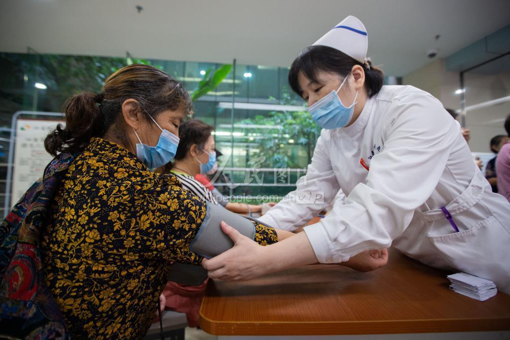 2021年10月8日,在江苏省中医院,护士为市民测量血压。