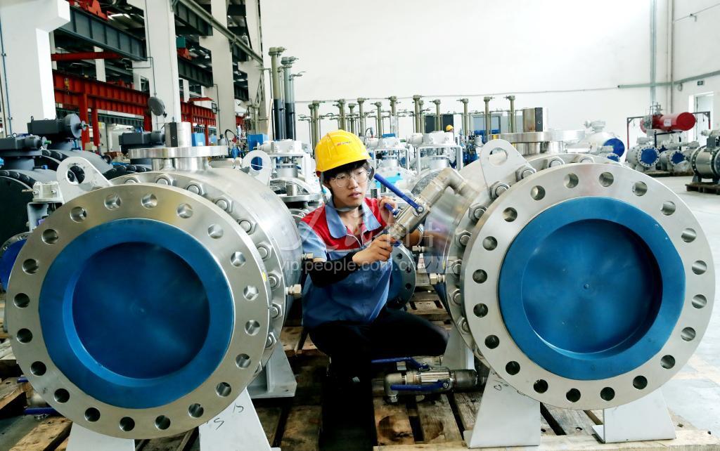 2021年10月9日,苏州纽威阀门股份有限公司技术员在车间检验出口阀门质量。