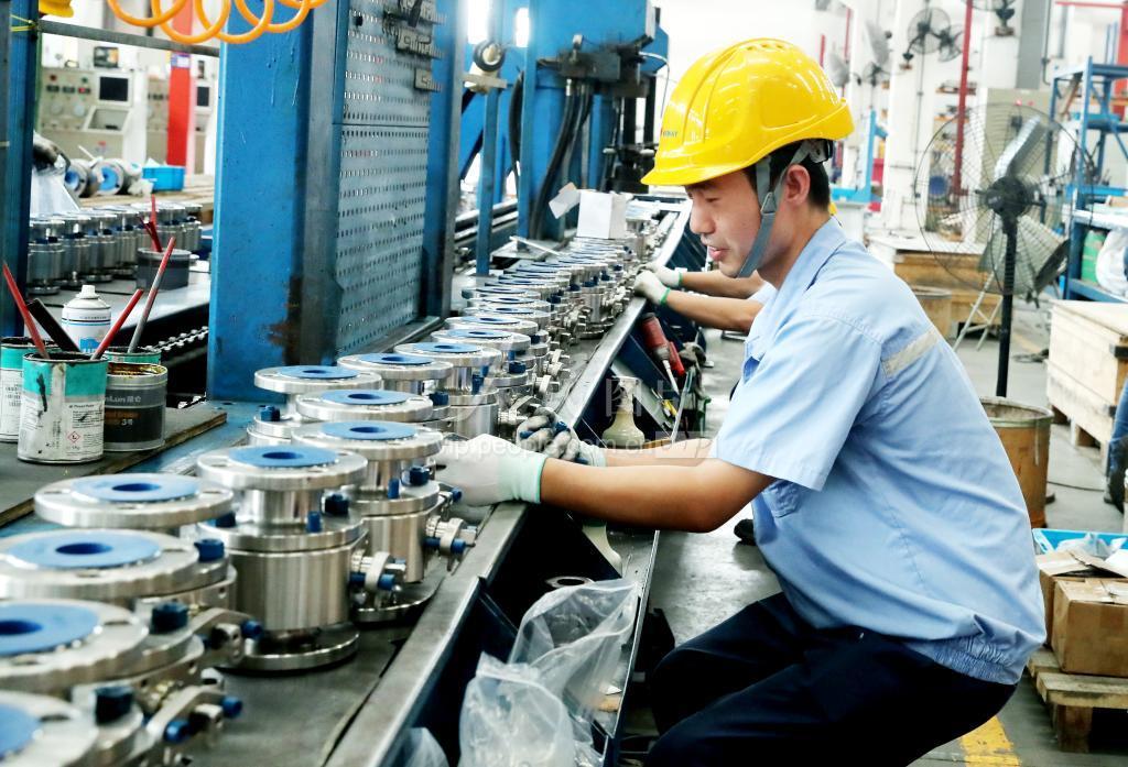 2021年10月9日,苏州纽威阀门股份有限公司员工在车间对阀门安装上压板。